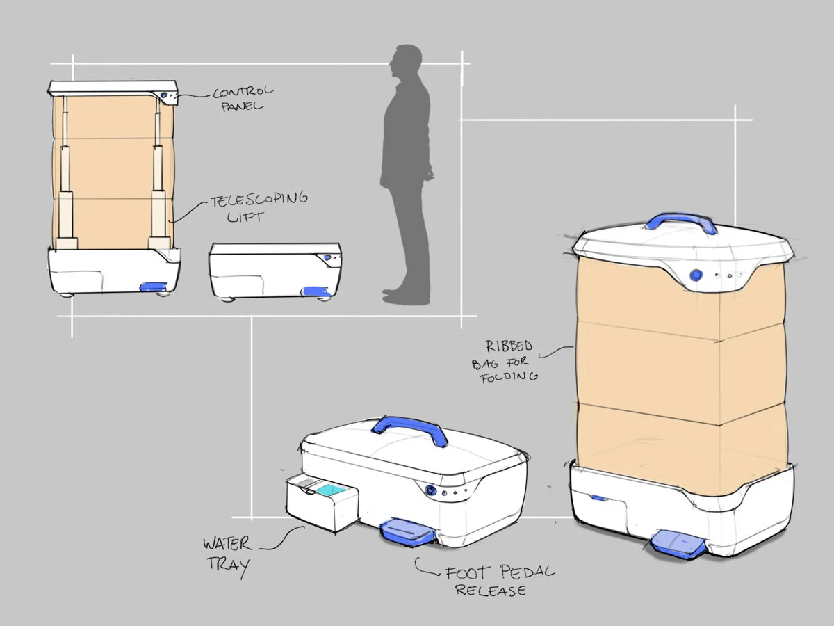 I developed the sliding and latching mechanisms that allow the lid to move up and down with minimal effort when expanding and collapsing the device. Inspired by “weightless” window blinds, the design uses constant-force springs to offset the weight of the lid and bowden cables to trigger the latch.